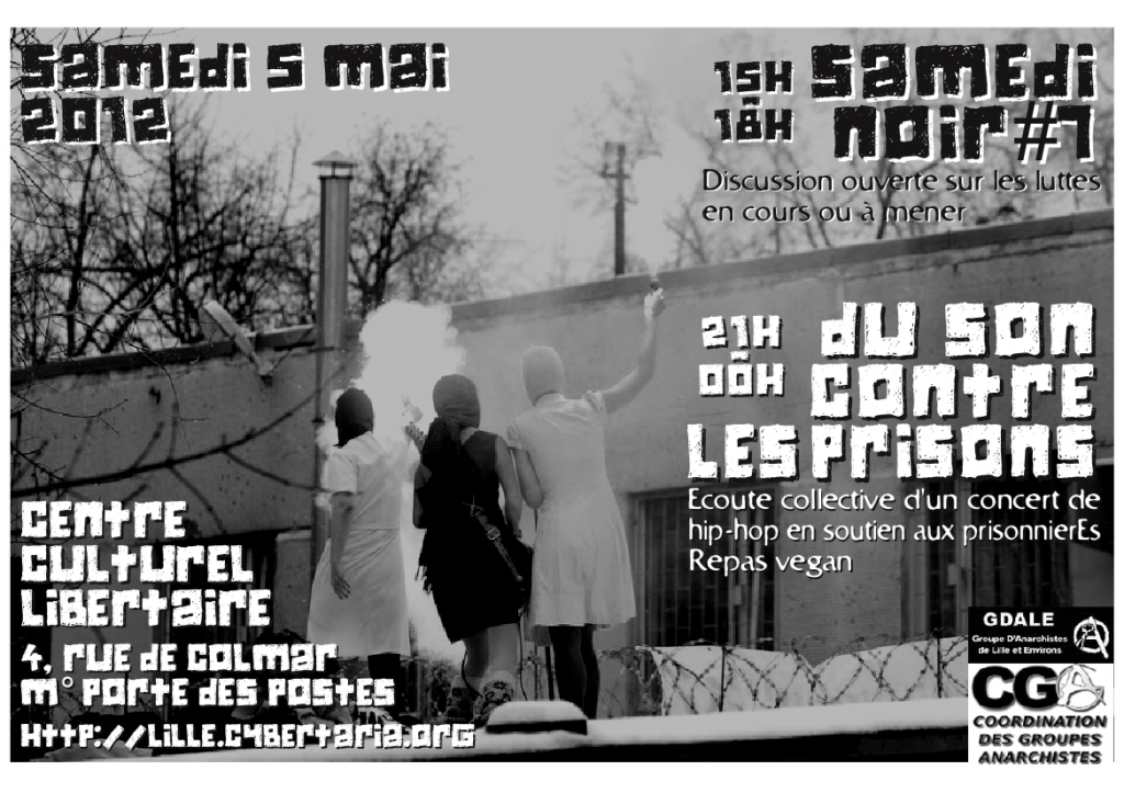 Cette fois-ci, en plus, il y aura un repas vegan et à partir de 21h jusqu’à minuit, une écoute collective en direct de la nouvelle édition du concert organisé à Saint-Étienne « Du Son Contre Les Prisons » que comme plein d’autres radios dans tout l’hexagone nous rediffuserons sur Radio Campus Lille, 106.6 MHz FM.