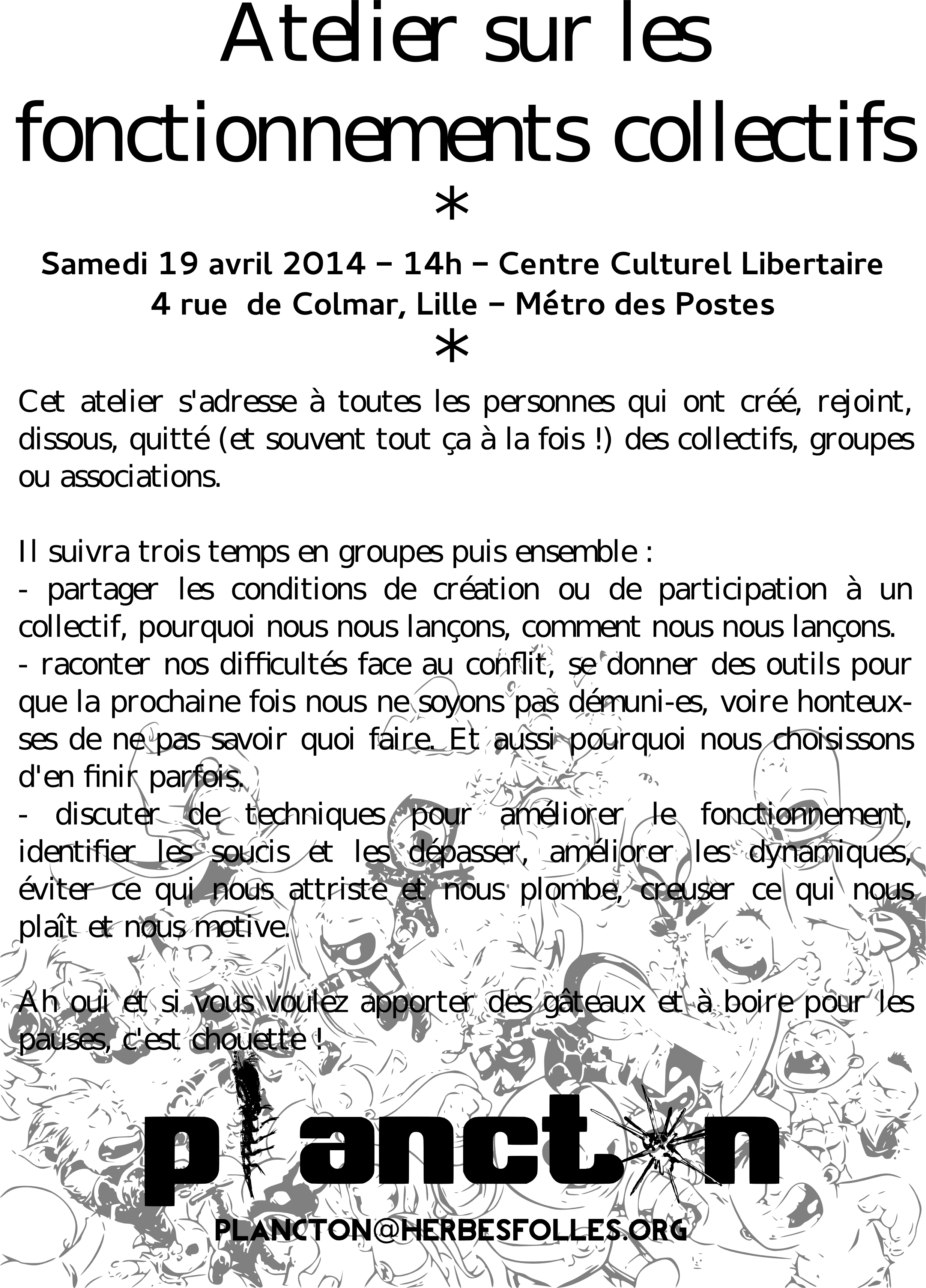 Après les ateliers d’autoformation vélo, informatique, internet, Plancton continue à parcourir les thèmes de l’autonomie et vous propose le samedi 19 avril 2014 à partir de 14h au Centre Culturel Libertaire