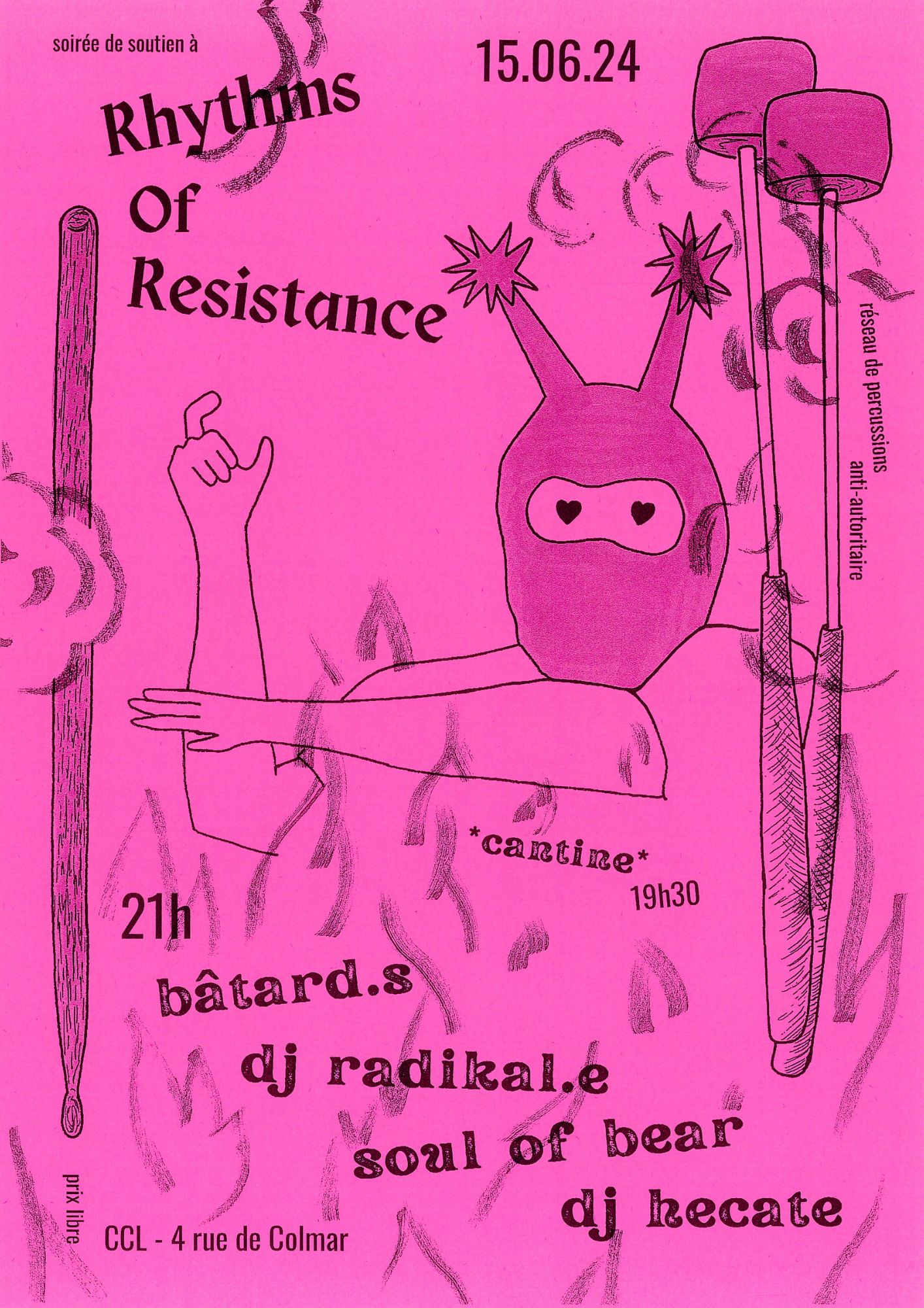 🥁 Le 15 juin, soirée de soutien à RoR, le collectif Rythms of Resistance, réseau transnational de percussions militantes, antiautoritaire, anticapitaliste et contre les oppressions systémiques, défendant la frivolité tactique dans les luttes 🥁