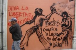 Ce n’est sans doute pas par hasard si tout a commencé en mai par une grève du corps enseignant. En effet, la section 22 , celle des profs de l’État de Oaxaca, se tient en marge du SNTE (Syndicat national des enseignant-e-s). Ce dernier, proche des pouvoirs politiques, reproche d’ailleurs au gouvernement de mener des négociations avec la section 22, qui ne jouit d’aucun statut juridique, alors que selon lui, seul l’organe syndical national est habilité à représenter et défendre le corps enseignant. Suite aux menaces d’exclusion de la section 22, un front anti-SNTE s’est crée parmi plusieurs associations de profs partout au Mexique, qui appelle à quitter la SNTE.